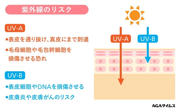 紫外線の影響で頭部の細胞やDNAが損傷すると皮膚炎を招いたり、抜け毛・薄毛を助長させたり、皮膚癌の発症リスクを高めたりするといわれています。