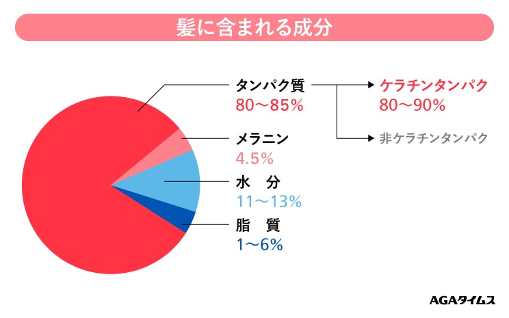 私たちヒトの体を構成するものとして水はよく知られていますが、同様にタンパク質も重要な生体成分といわれています。大人と子供で違いはあるものの、人体を構成する要素の約60%が水、そして次に多い生体成分がタンパク質で人体構成要素の約20%をしめます。髪の毛についてもタンパク質の存在は大きく、約80%がタンパク質からできています。そのタンパク質はケラチンタンパクと非ケラチンタンパクにわかれ、髪の毛をつくるタンパク質のほとんどはケラチンだとされています。
