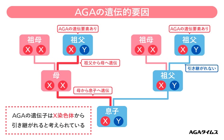 AGAに関する遺伝的要素は複数存在しますが、その中のいくつかの遺伝子情報は「X染色体」に存在します。ヒトは常染色体のほか性決定に関与する「性染色体」を持っていますが、性染色体は男性なら「XY」女性なら「XX」と性別によって異なる組み合わせで存在します。男性ホルモン受容体の感受性に関する一部の情報は女性(母親)から引き継ぐX染色体上に存在すると考えられているため、母方の家系にAGAの傾向がある場合はAGAの素因をもつ可能性が高いと考えられます。