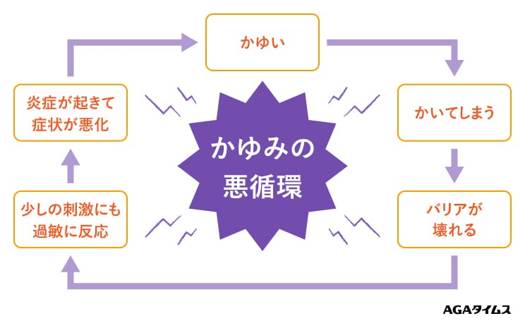 頭皮が乾燥するとバリア機能が低下して、わずかな刺激でもかゆみが生じるようになります。それを掻くと皮膚に傷がつき、皮膚のバリア機能が低下します。するとアレルギー反応を起こしやすくなり、以前よりも容易にかゆみを感じるようになる悪循環に陥りかねません。頭皮環境が悪化することで抜け毛の要因にもなります。