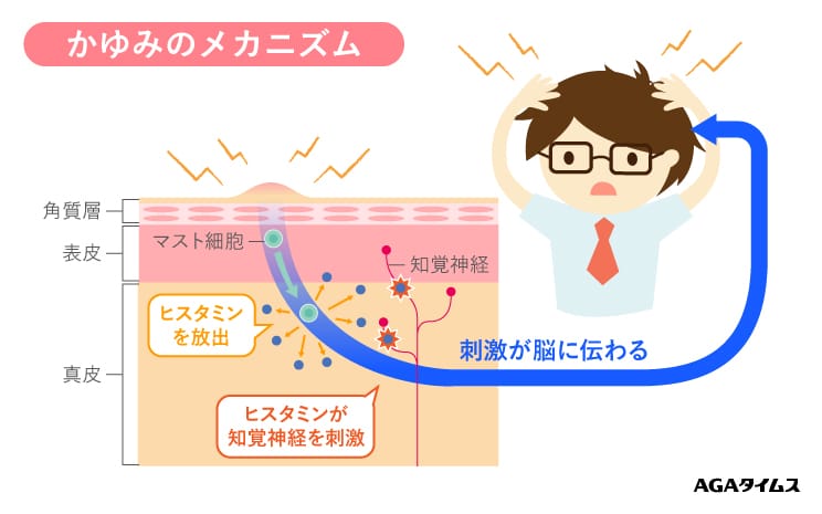 頭皮に炎症が生じるとヒスタミンなどが放出され、C繊維を通じて脳に情報が伝わり、かゆみを感じます。それだけでなく、湿疹で皮膚が荒れると、角質層の隙間から水分が蒸発して乾燥肌になりがちです。するとC繊維の先端が皮膚表面近くまで伸び、わずかな刺激にも敏感になって、よりかゆみを感じやすくなってしまいます。