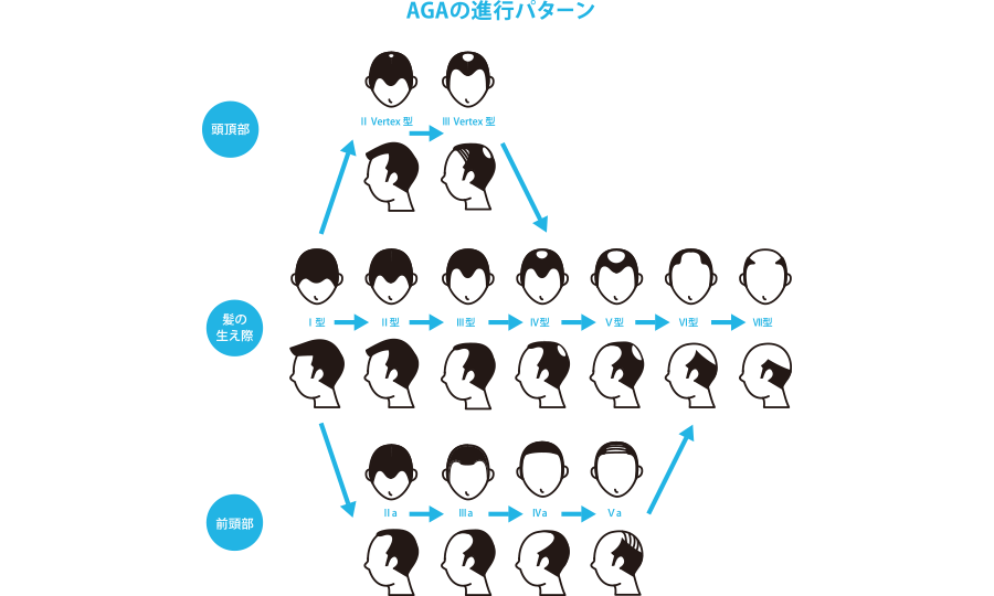 またAGAの診断基準として進行パターンや進行レベルが分類されています。頭頂部と前頭部の薄毛が徐々に同時進行していくパターンや前頭部や生え際から進行していくパターンなど様々です。日本人の場合「つむじハゲ」に当たる頭頂部の薄毛のみが進行するパターンが多く見られることから、日本人に多い進行パターン(Ⅱvertex)を加えた「高島分類」を用いることもあります。