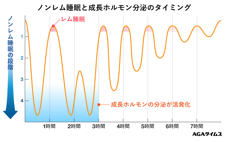 睡眠は4段階に分かれており、4段階目が最も深い眠りのレベルになりますが、成長ホルモンは睡眠の3段階目から4段階目のタイミングに当たるノンレム睡眠中に分泌が活発になるとされています。このタイミングで成長ホルモンの1日の分泌量のうち男性は約60~70%、女性は約50%が分泌されるといわれています。