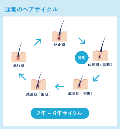 下記のように、ヘアサイクルが一周するためには年単位の長い期間を要します。その長い期間中にある「成長期」「退行期」「休止期」において、髪の毛はそれぞれどのような状態にあるのでしょうか。ヘアサイクルのメカニズムについて詳しくみていきましょう。