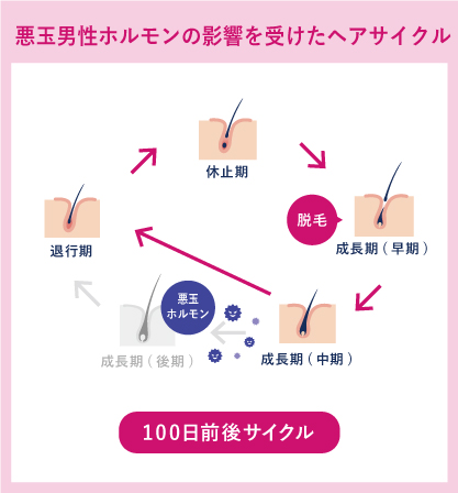 次からは、ヘアサイクルが乱れる原因について説明します。主な原因としてあげられるのは「AGA(男性型脱毛症)」「生活習慣」「加齢」「季節」の4つです。