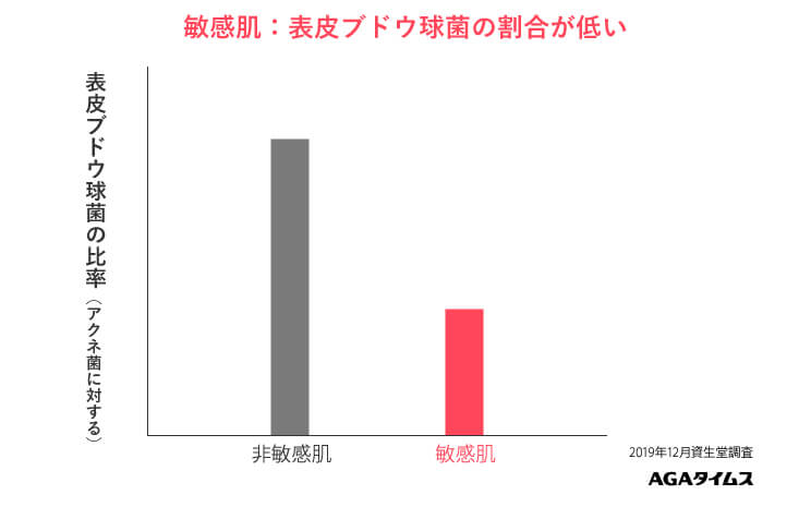 株式会社 資生堂における皮膚常在菌の研究では、肌水分量が多く赤みが少ない健常肌に比べて、敏感肌の菌叢はアクネ桿菌に対して表皮ブドウ球菌の割合が低いことが分かっています。このことからも、肌の健康状態において常在菌のバランスがいかに重要かが分かります。