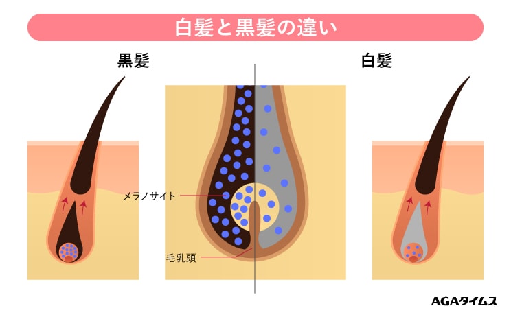 髪の毛は本来、灰白色をしており髪の毛が生成される過程で着色され、色を持つようになります。私たちの髪の毛を着色するのは「メラニン色素」と呼ばれるもので、メラニン色素は「メラノサイト」という細胞から合成されます。つまり白髪は、メラニン色素を生み出す過程で障害が生じた結果、髪の毛に色がつかずに生えてきた髪の毛ということです。その原因の一つとして、メラニン色素を生み出す機能の低下が考えられます。