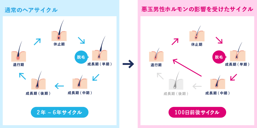 日本では薄毛に悩む成人男性のほとんどがAGA(男性型脱毛症)であるといわれています。AGAは主に男性ホルモンが髪の毛の生え変わりのサイクル(ヘアサイクル)に悪影響を及ぼし、十分に育つ前の細い髪の毛が増えたり抜け毛が多くなることで結果的に薄毛になってしまいます。