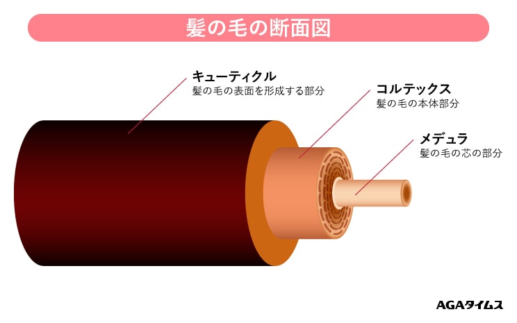 髪の毛の構造は大きく分けて「メデュラ」「コルテックス」「キューティクル」の3層に分かれており、海苔巻きのような形状になっています。